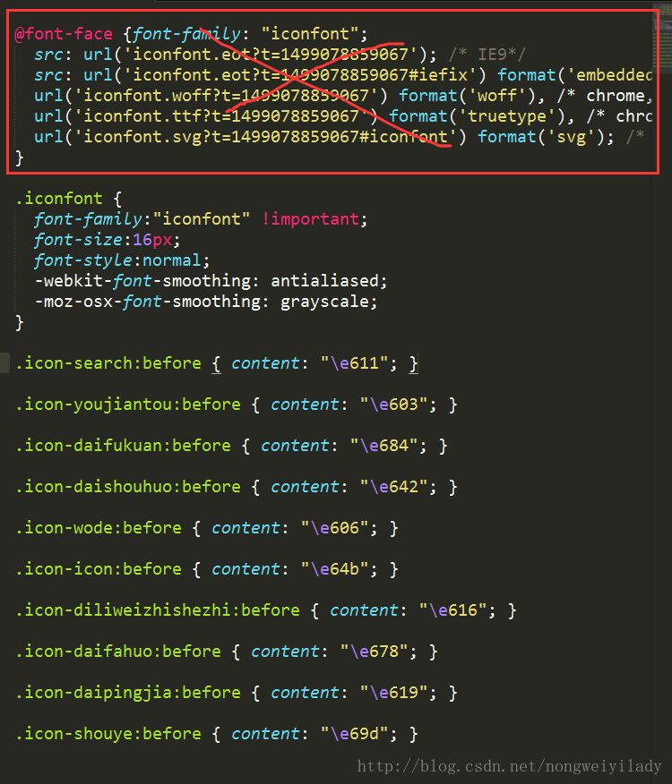 2–打開沒有轉換過的download.zip解壓出來的文件,找到iconfont.css文件,將這個文件中的沒有打岔的內容復制到index.css文件中。@font-face這部分不要,只要下邊的這部分。