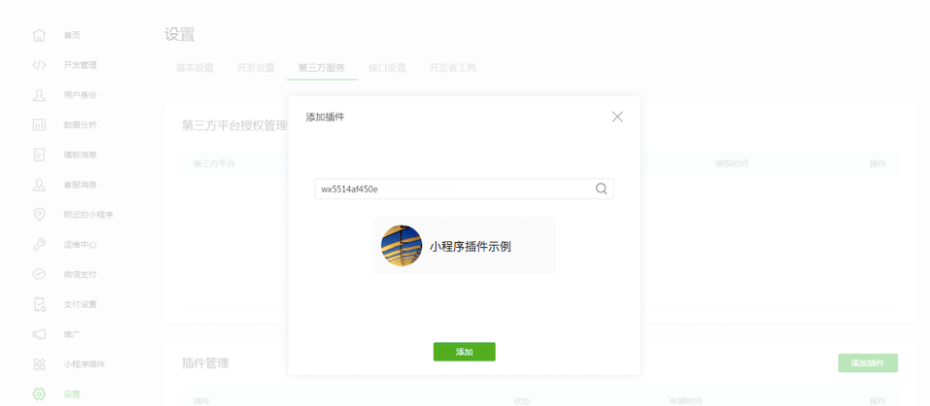 小程序開發(fā)者可在”小程序管理后臺-設置-第三方服務-插件管理“中,根據(jù)AppID查找需要的插件,并申請使用。插件開發(fā)者在24小時內(nèi)通過后,小程序開發(fā)者可在小程序內(nèi)使用該插件。